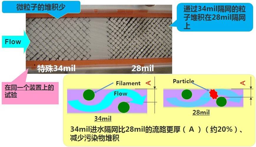 在眾多抗污染的機(jī)理中,反滲透膜元件給水流道的寬度已經(jīng)是公認(rèn)的膜元件抗污染性能的最重要指標(biāo),也是用戶在選擇產(chǎn)品時(shí)需要考慮的重點(diǎn)。進(jìn)水流道越寬,系統(tǒng)對(duì)進(jìn)水水質(zhì)的要求和預(yù)處理設(shè)備不正常工況的要求相對(duì)來說越寬松。較寬的進(jìn)水流道,可以更有效的進(jìn)行膜清洗,即使在高污染條件下,系統(tǒng)仍可維持較低的壓降。但是進(jìn)水隔網(wǎng)厚度增加時(shí),由于進(jìn)入膜元件給水的流量不變,導(dǎo)致給水在流道內(nèi)流動(dòng)的速度降低,加強(qiáng)了膜表面的濃差極化現(xiàn)象,進(jìn)而使污染物更易在膜表面吸附。因此,進(jìn)水隔網(wǎng)的厚度存在一個(gè)最優(yōu)范圍,且隨膜元件不同的應(yīng)用領(lǐng)域而不同,在線路板廢水回用中應(yīng)選用流道寬度為34mil的反滲透膜元件。