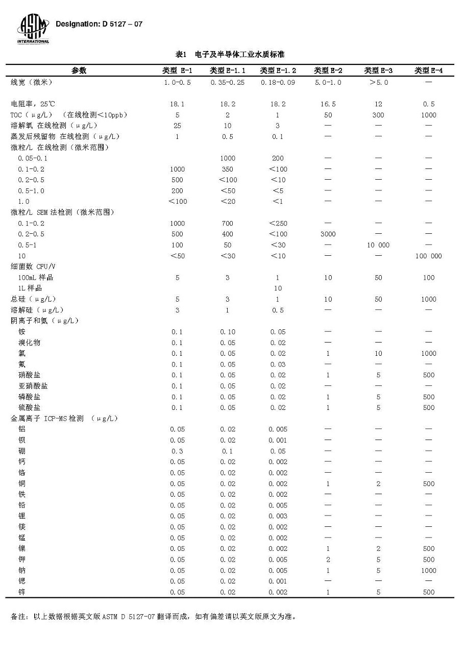 在電子工業(yè)的生產(chǎn)工藝中,相當(dāng)多的工序要進行化學(xué)處理,而電子產(chǎn)品的清洗和化學(xué)藥劑的制備都直接或間接地要利用到純水或超純水。隨著電子工業(yè)的發(fā)展,尤其是以超大規(guī)模集成電路為代表的半導(dǎo)體產(chǎn)業(yè)的發(fā)展,對純水的水質(zhì)提出了更高的要求,下表所列為美國材料測試協(xié)會(ASTM)根據(jù)半導(dǎo)體特性而制定的超純水水質(zhì)要求。