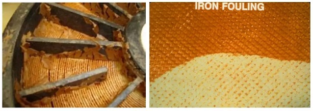 芬頓反應(yīng)采用硫酸亞鐵作為催化劑,過(guò)氧化氫作為氧化劑來(lái)氧化降解廢水中的COD有機(jī)物。與臭氧工藝相比,芬頓法的成本較低,因此在許多高濃度有機(jī)廢水處理中得到了廣泛應(yīng)用。廢水經(jīng)芬頓法處理之后,一般會(huì)殘留>1mg/l的亞鐵離子。由于亞鐵離子為溶解性成分,在UF+NF/RO的雙膜法工藝中,溶解性的亞鐵離子會(huì)一直透過(guò)所有的過(guò)濾介質(zhì)直到納濾進(jìn)水池。而由于控制微生物的需求,我們需要在進(jìn)水池中保持一定的余氯,于是,亞鐵離子會(huì)被余氯部分氧化,形成難溶的氫氧化鐵。這一點(diǎn)是對(duì)納濾最大的危害。