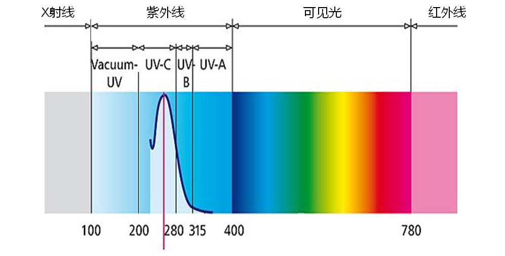 波長(zhǎng)介于200~280nm之間,其中240~280nm紫外線為細(xì)菌及病毒DNA所吸收,從而破壞細(xì)菌及病毒DNA,使其不能復(fù)制繁殖。DNA在265nm處具有最大吸收峰。